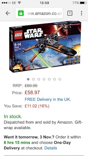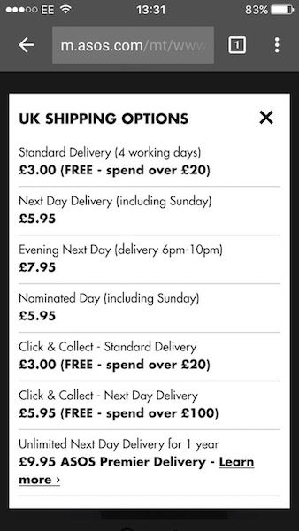 Amazon has an annoying habit on its mobile site where if you want a next day or nominated day option, you won’t know the charge until the very last screen. On the product page itself, the mention of next day delivery is clear with a real-time indicator adding urgency. However that ‘details’ link doesn’t directly tell you the prices of each option.