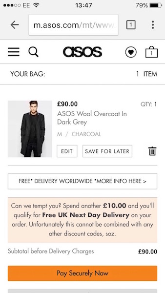 It’s a masterclass in simple, clear messaging on mobile, while keeping the customer in focus, as well as offering premium delivery options that won’t make you balk at the cost.