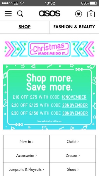 The Asos homepage on a desktop however has a clear ‘free delivery’ message at the top with a link to a list of delivery charges.