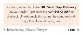 If you haven’t already checked the delivery options or pricing you may not find out until you look in your basket. Here you may be surprised to see the rather steep delivery threshold of £100.