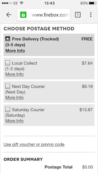 If I was in a rush, and not testing out the site for an article on mobile commerce, there’s a good chance I would have bailed before filling in all my address details just to get to this point, where I find out that even though I’m spending more than $200 I still have to pay for local collect.