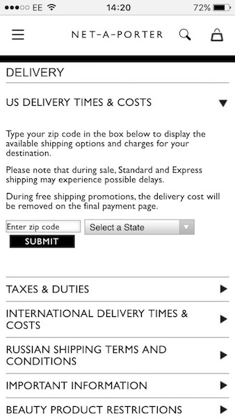 This retailer similarly has no link or messages regarding its delivery options on the homepage or in the menu. The first mention of delivery is a scroll down the product page, where you’re promised free delivery but no clue as to options.