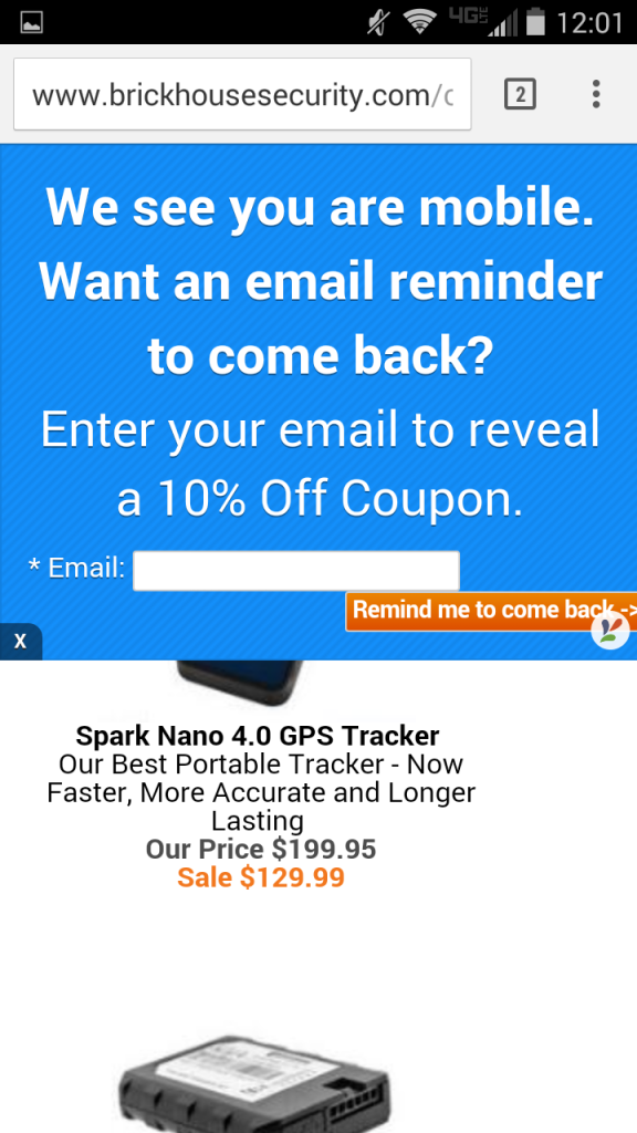• Use browser detection tools to deliver a proactive targeted message. Shoppers on mobile devices can receive custom messaging encouraging them to return, as on MarketLive merchant Brickhouse Security’s site. Shoppers who enter their email addresses receive an incentive to visit again.