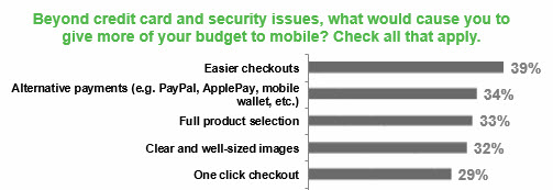 To improve on those numbers, though, merchants must remove significant impediments to purchase — checkout being chief among them. When asked what would spur survey participants to spend more via mobile devices, smoother checkouts and the availability of alternative payment options that circumvent checkout, such as Paypal, topped the wish list, and one-click checkout rounded out the top five.