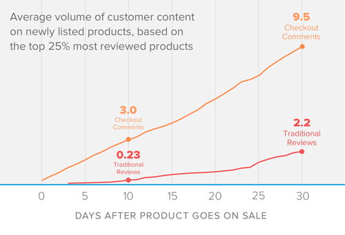 We recently ran a study looking at the rate at which these “checkout comments” build up. We found that overall, when that question is posed in a modal window on the order confirmation page, shoppers provide an answer on 10-15% of all orders. For most stores, that’s a rate 3-5 times higher than the rate at which they collect customer reviews. And for new items, the first comments start to arrive, on average, 10 days earlier than with traditional reviews.