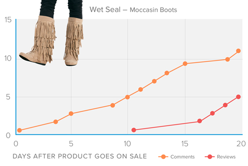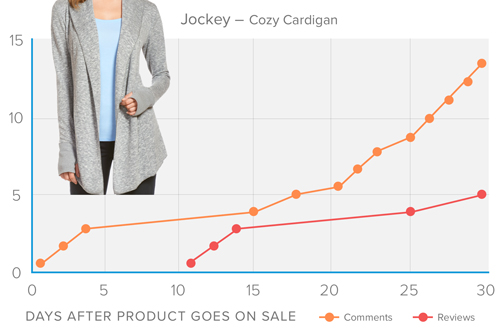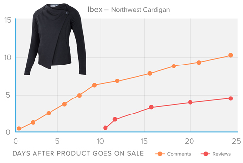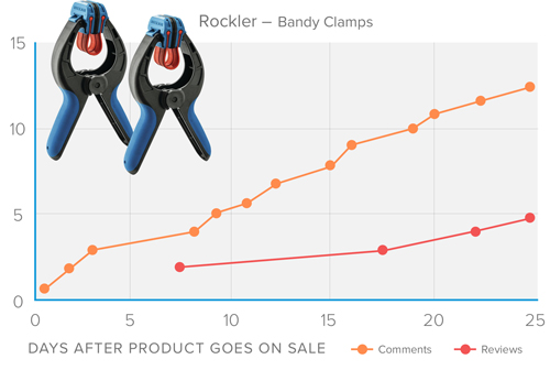 From our study, we’ve called out 4 examples to illustrate the differences in the rate of content build-up between checkout comments and customer reviews when items first go on sale and over time. We selected these items because they were among those that received the most, fastest reviews. These examples show that even compared to the most successful review collection efforts, checkout comments start coming in much sooner – usually on the first day a new item is available – and build up much faster.